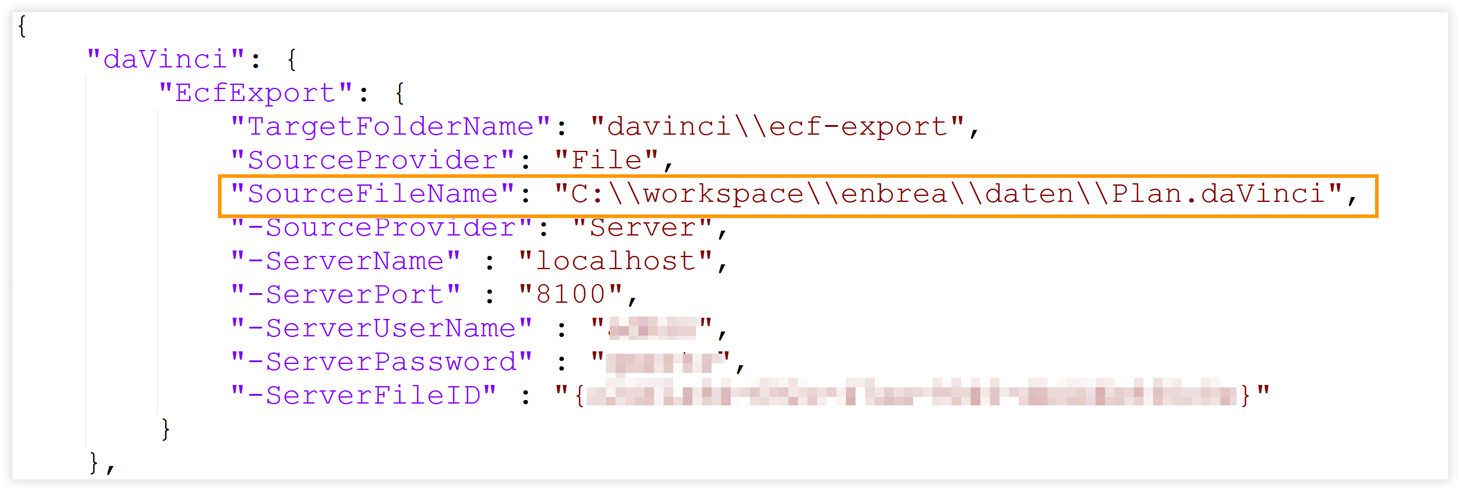 Als Alternative zum Zugriff auf eine vom DaVinci Enterprise Server verwaltete Plandatei kann auch direkt auf den Speicherort einer Plandatei verwiesen werden. Wenn Sie den Speicherort nicht ändern und auch den Dateinamen ggfs. beibehalten, ist hier auch keine Änderung in der Konfigurationsdatei enbrea.json notwendig. Hat die neue Datei einen veränderten Speicherort und/oder einen veränderten Namen passen Sie bitte folgenden Eintrag an: