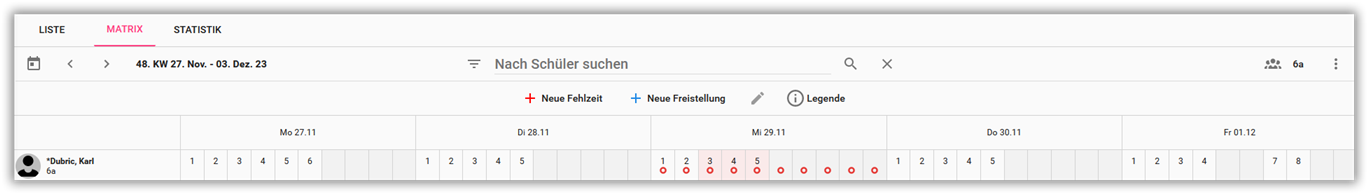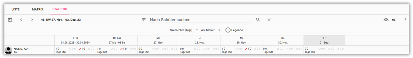 Beispiel für die Anzeigen in der Liste der Fehlzeiten, Matrix und Statistik¶