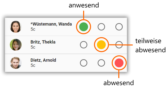 Klicken Sie pro Schüler auf eine der 3 Spalten, um die 3 Status
